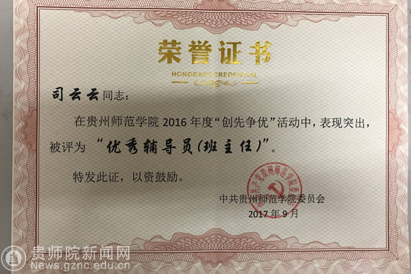 司云云获得伟德官网”优秀辅导员“荣誉证书