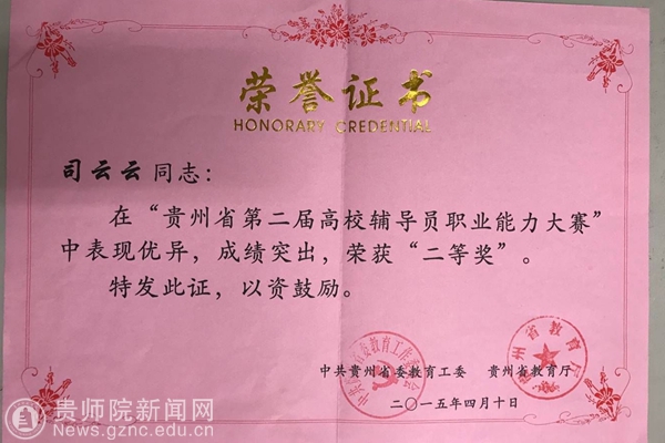 司云云获得第二届职业能力大赛二等奖荣誉证书