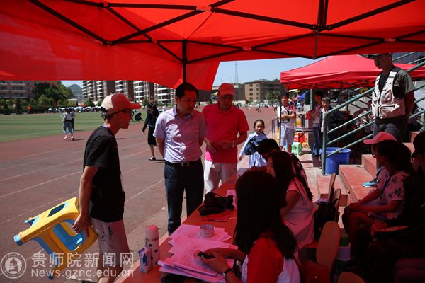 石培新先视察了医务点、服务点和运动员赛前检录处,慰问工作人员,肯定了大家的工作。