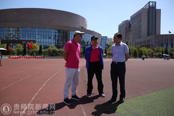 随后,石培新一行来到篮球场,参观学校健身设施,共同探讨了关于体育学院未来的发展问题。黄伟明介绍了学院规划,拟定在现有篮球场右边新建一个网球场,体育学院还将修建一个室内操场,健身区域也会有所调整。之后,他们来到体育场主席台观看甲组学生4*100接力赛,为参赛队员加油助威。