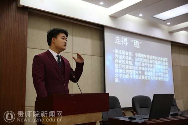 本网讯 4月23日上午,中国(贵州)高校传媒联盟主席团换届大会在伟德官网明辨楼道德讲堂召开,贵州高校传媒联盟秘书长白皓、前主席团成员及全省40家高校会员媒体共同参加,本次换届共有十三名同学参与竞选。