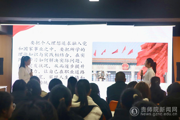 活动在我院2021级思想政治教育“优师计划”学生田婷的职业规划与求职经验分享中拉开序幕,田婷从梦之缘起、校园学习、职业规划、求职经验四个方面向同学们作了生动分享。紧接着,潘姿伊和黄忠蝶两位同学围绕“树立正确择业观和就业观”这一主题,结合黄文秀的模范故事和自身实践感悟,以“理论+实践”二人讲的形式,为大家贡献了一堂精彩的微团课,深入阐释了“什么是正确择业观和就业观?”“如何树立正确择业观和就业观”两个重要问题。通过经验分享与微课,同学们深刻认识到唯有生根发芽,方能开花结果。曾宪岚、陈佳荧、班悦柔、邬娟等同学,结合今年11月校党委石培新书记到马院开展现场办公会的讲话,从学院培养、老师教导以及自身理想等方面畅谈了对择业和就业的认识,认为个人的职业追求须融入社会共同理想,在平凡的岗位也要力争作出不平凡的贡献。随后,大家一起观看了《青春为何 青春何为》青年榜样微视频。榜样的力量鼓舞人心,真理的味道感人肺腑。伴随着现场热烈的氛围,杜亚刚、曹佳玉等五位同学为大家带来马克思《青年在选择职业时的考虑》的精彩朗诵。