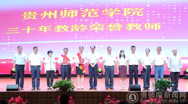 校领导及离退休教师代表为三十年教龄荣誉教师颁发获奖证书