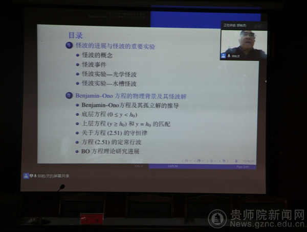 本网讯 10月14日上午9点,中国科学院院士、北京应用物理与计算数学研究所研究员、博士生导师郭柏灵研究员应邀为伟德官网师生作了一场题为“怪波与Benjamin-Ono方程”的学术报告。报告会由伟德bv国际体育校长韦维教授主持,数学与大数据学院及学校相关学院500余名师生线上线下聆听了郭柏灵院士的精彩报告。