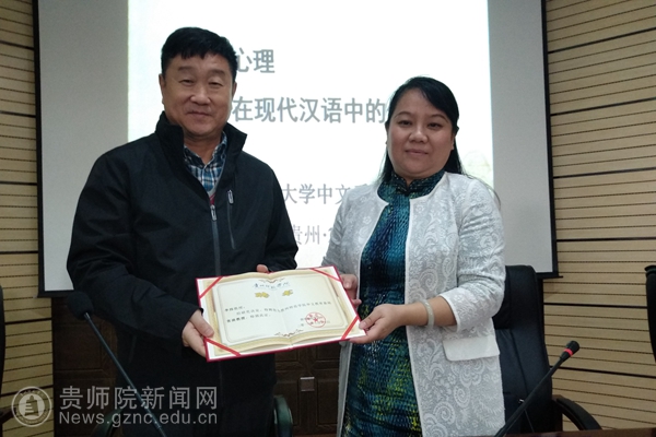 座谈会结束后,文学院党委书记、华文教育基地办公室主任韦丹老师代表基地向李炜教授颁发了华文教育基地客座教授聘书。