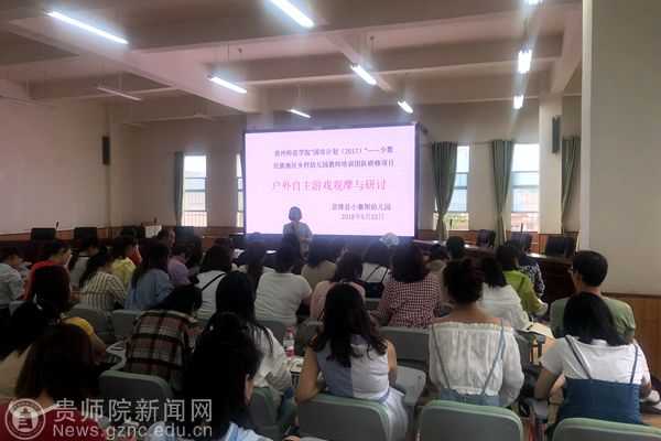 本网讯 5月22日上午,“国培计划(2017)”——少数民族地区乡村幼儿园教师培训团队研修项目学员赴息烽县小寨坝幼儿园就“户外自主游戏活动的开展”进行观摩与研讨,教育科学学院国培班主任张源及教科院学前教育专业李建年、刘英、何玉红、李姿雨老师参加了本次活动。
