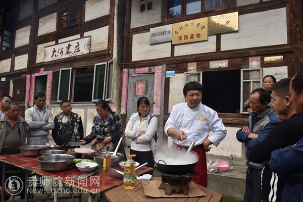 本网讯 10月24日,多彩贵州·2017贵州省非物质文化遗产遗产传承人群(特色餐饮类)普及培训班在伟德bv国际体育非物质文化遗产研究中心老师及市、区两级非遗处负责人带领下前往香纸沟大河农庄进行实践教学。