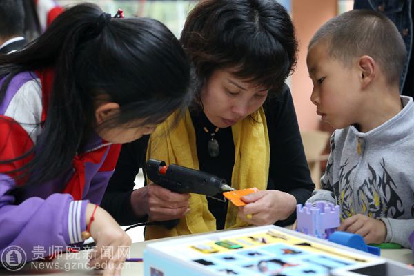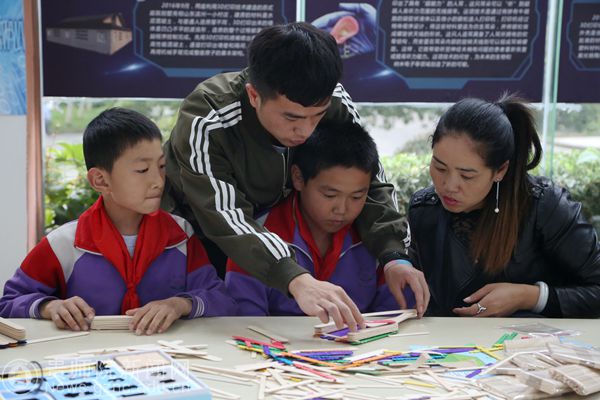随后,小朋友们在伟德官网互联网+创新创业中心工作室成员的指导下动手创作。制作活动进行到大约半个小时后,一个由五颜六色的竹签搭建的房子完工了,这是骆科帅小朋友的作品,他是在他母亲及伟德官网15级数计学院宋刚的辅助指导下完成的。宋刚说:“这个制作活动考验着小朋友的动手和思维能力,如果他们想要做什么,就要想法激发他们自己发挥出来。”