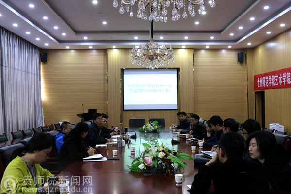 何林在讲话中,首先肯定了艺术学院在科研建设、艺术创作和教学等方面取得的成绩,同时指出,学院发展一定要有目标、任务驱动,学院班子成员要有长远眼光,超前谋划的意识。他对艺术学院提出三点要求:一是班子成员要齐心协力,共同协作,主动想法子,创造性地开展好学院工作;二是把艺术学院特色和地方资源优势结合起来,寻找学科科研与办学特色,找准以适应贵州发展需要的人才培养模式,开展好与地方对接和行业对接的舞蹈、音乐、美术项目,提高教师的创作水平的同时提高学生的艺术创作能力;三是要注重学科建设,以开放的心态,结合艺术学院的艺术之星技能大赛等大型活动平台扩大学院的美誉度与知名度。
