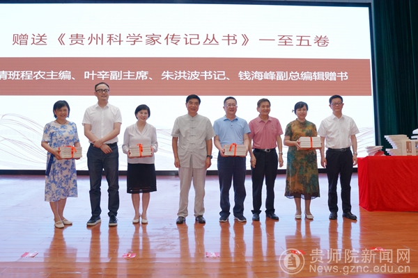 大会上,《贵州科学家传记丛书》编委会副主任、执行主编杨献忠介绍编撰情况,省人大常委会副主任杨永英、编委会主任班程农、科学家代表罗锡文院士、谢晓尧教授为新书揭幕,班程农主编、叶辛副主席、朱洪波书记、钱海峰副总编辑赠书《丛书》1-5卷,8位科学家为10位学生代表赠书《故事》1-4册,《贵州科学家传记丛书》集中展现了科学家对国家科学技术发展做出的重大贡献以及对贵州这片热土的奉献和热爱,表现了科学家在艰苦条件下的拼搏精神,弘扬了“科技兴国”“科技兴黔”的时代精神,将引导全校师生以这些科学家为榜样,胸怀“国之大者”、继续“追光”前行,以更加奋发有为的精神状态和一往无前的奋斗姿态为实现贵州省高质量发展的目标凝聚磅礴力量。