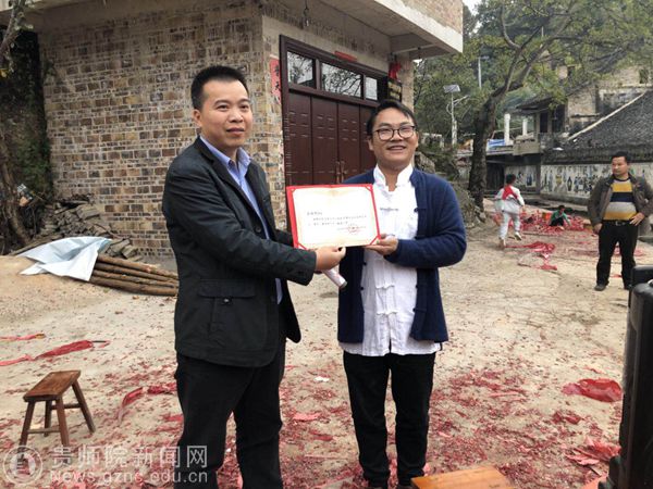 随后,伟德官网民族教育研究院杨定玉教授、陈志永教授、廖斌、凉伞村村民龙明开共同为“中国乡土社会研究中心(贵州)凉伞研究基地”揭牌,杨定玉教授还为施秉县委党校原副校长宋永泉以及村落精英龙明开颁发“中国乡土社会研究中心(贵州)兼职研究员聘书”。