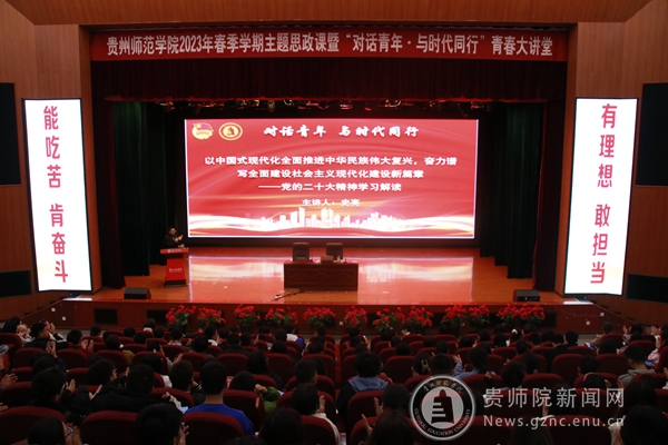本网讯为持续深入学习宣传和全面贯彻落实党的二十大精神,讲好“印山青年”宣讲团示范课,激励全校青年教师和广大学生以高度的政治责任感和使命感,践行“为人师表”的校训精神,立志做有理想、敢担当、能吃苦、肯奋斗的新时代好青年努力奋斗。3月31日下午,校团委联合宣传部于逸夫楼演播厅开展2023年春季学期主题思政课暨“对话青年,与时代同行”青春大讲堂,邀请到中共贵州省委党校(贵州行政学院、中共贵州省委讲师团)宣讲教研处副处长,贵州省十佳宣讲员史亮老师作党的二十大精神专题讲座。校党委宣传部部长薛璞、校团委书记罗荣、校党委宣传部副部长周煜、校团委副书记伍玲婧出席讲座,辅导员代表、“印山青年”学子宣讲团成员、青马工程学员以及各学院学生代表300余人参与学习。
