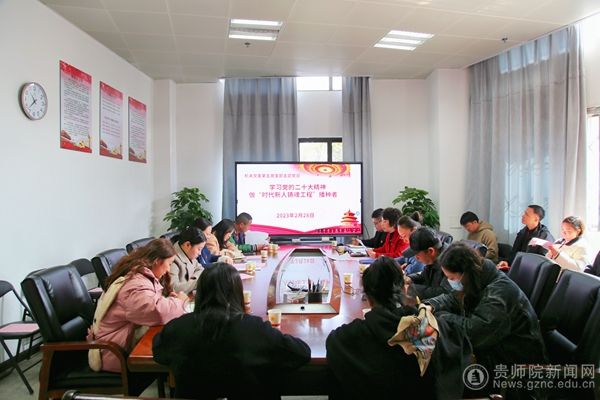 活动中党支部全体党员集中学习相关会议精神和文件,党支部书记刘红玲领学2023年全国、全省教育工作会议精神,党支部副书记罗荣领学《习近平在学习贯彻党的二十大精神研讨班开班仪式上发表重要讲话》,宣传委员官鹏飞领学《中国共产党普通高等学校基层组织工作条例》节选,2023年教育部思政司工作要点、纪检委员陈光俊针对党风廉政工作组织党员同志学习相关文件和会议精神。学工部副部长杨兴萍、心理健康咨询中心张睿老师围绕学习内容分享自己的心得体会,最后党支部书记刘红玲总结发言。