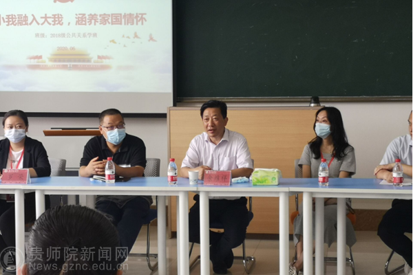 此次活动由王红都主持。首先,18级公共关系班班长陈禹彤介绍了班级这两年的发展情况以及特色亮点的系列活动。如:组建导师组、学习活动、实践活动、策划公关巡讲大会、参与营销策划大赛及数博会志愿者等相关活动,得到了余维祥的及各位老师的肯定和鼓舞。紧接着,余维祥向同学们分享了作为人大代表参加两代会的感想,感叹中国经济发展迅速、整体形式向好的一面发展。余维祥鼓励同学们,要勤学上进,在这个大好的时代加倍努力,为家乡为国家尽职尽责,发扬新时代青年的有为与担当,培养家国情怀。同学们备受鼓舞。