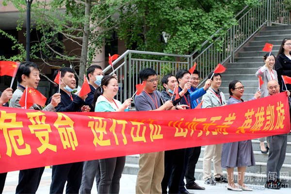 信息楼前,一面面小红旗迎风飞舞,工作人员手捧着鲜花散发着诱人的清香,“临危受命,逆行出征、山河无恙,英雄凯旋”“白衣执甲、救死扶伤,不辱使命、载誉归来”的横幅上写满了对“逆行者”邬卫东平安归来的祝福与崇敬。