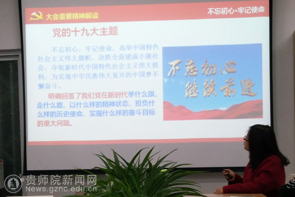 接着,吴光梅详细解读了党的十九大主题,要求全体同学深入贯彻学习习近平总书记在报告中对青年说的话,志存高远,脚踏实地,勇于担当。