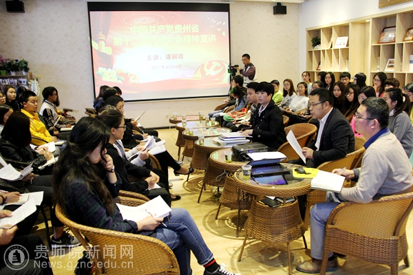 本网讯 4月24日下午,为深入学习贯彻中国共产党贵州省第十二次党代会精神,学工部组织辅导员代表、学生代表在学生事务服务中心书香茶吧举行学习座谈会,会议主要分为两个阶段,第一个阶段由参加此次会议的伟德官网党代表谭丽琼老师为大家宣讲会议精神;第二个阶段由各参会人员谈自己的学习体会。会议由学工部部长薛璞主持。学工部副部长刘讯、辅导员代表及学生代表60余人参加了会议。