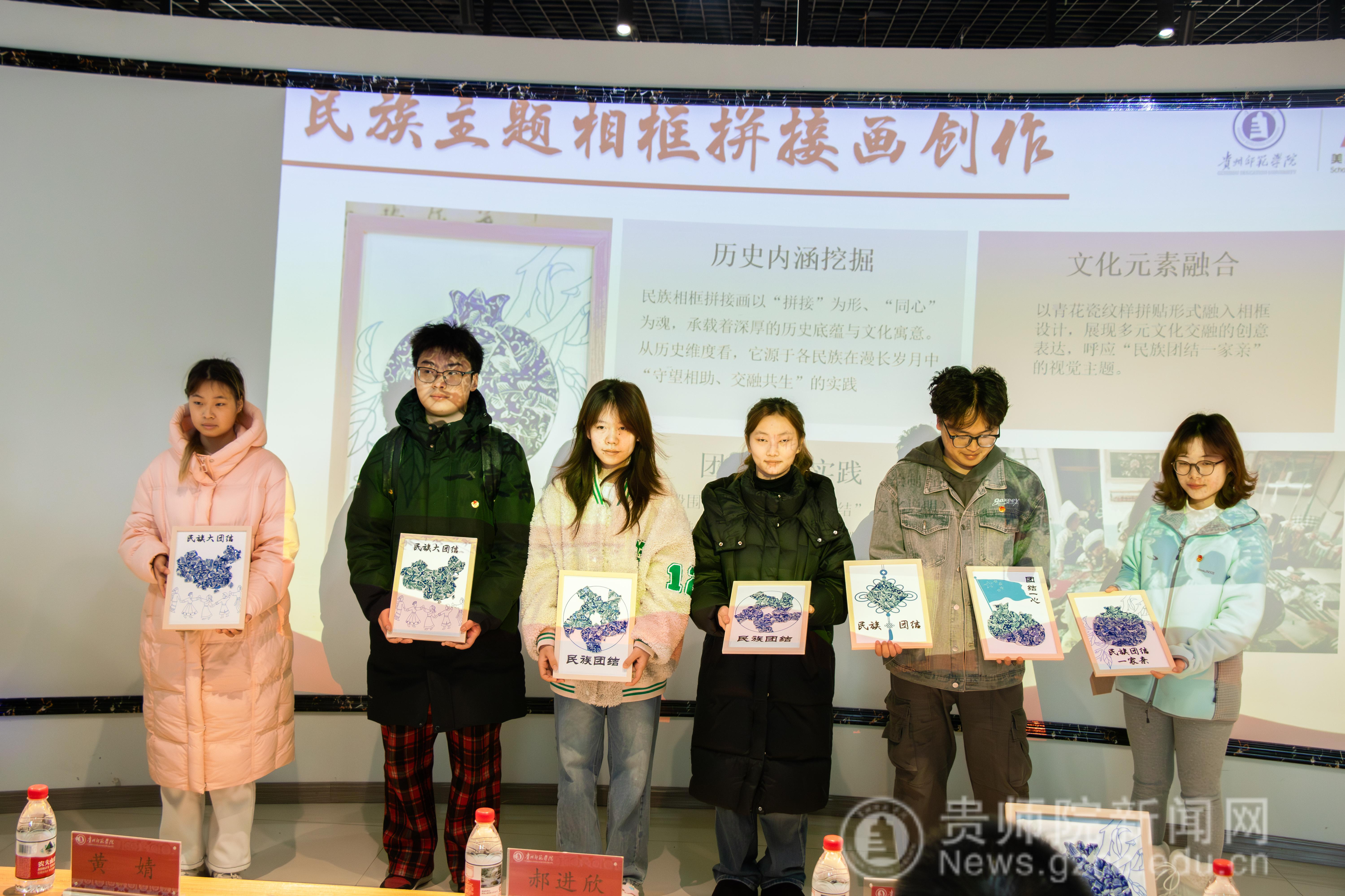 相框拼接画创作环节是活动亮点。与会师生们齐心协力、默契配合,一幅幅由青花瓷片精心拼接而成的石榴图栩栩如生,中国结造型跃然纸上,立体而精美,传递民族团结如石榴籽般紧密相连的信念。