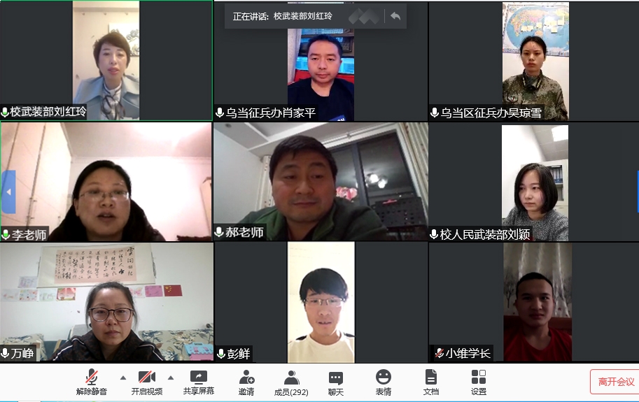 本网讯 4月29日,伟德bv国际体育2020年征兵工作云端宣讲咨询会顺利举行。由于当前处于抗击疫情的特殊时期,根据学校2019年征兵工作总结表彰暨2020年征兵工作推进会议精神,学校人民武装部和乌当区人民武装部利用线上平台开展了此次宣讲咨询会。参加此次会议的有学校人民武装部征兵人员和乌当区人民武装部征兵人员,二级学院征兵工作老师代表以及近300名有参军意愿的同学。会议由学校人民武装部刘颖老师主持。