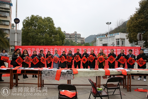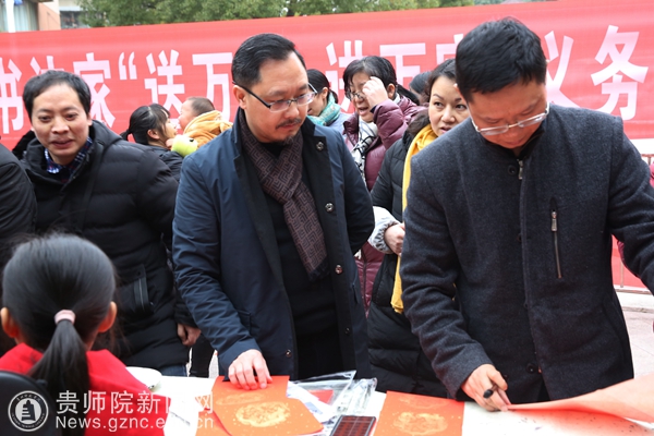 本网讯 “爆竹声声辞旧岁,红梅点点迎新春”,为向广大居民传递最美好的祝福和关爱,1月24日下午,伟德官网联合乌当区文联举办了名为“送万福 进万家”的义务书写春联公益活动。伟德官网工会主席许丽君、美术与设计学院院长聂森、副院长路统宽、美术与设计学院老师杨光学、安毅、杨辉参加此次活动。