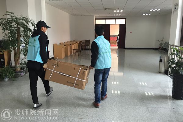 读者协会同学搬运各类展架到活动地点安放