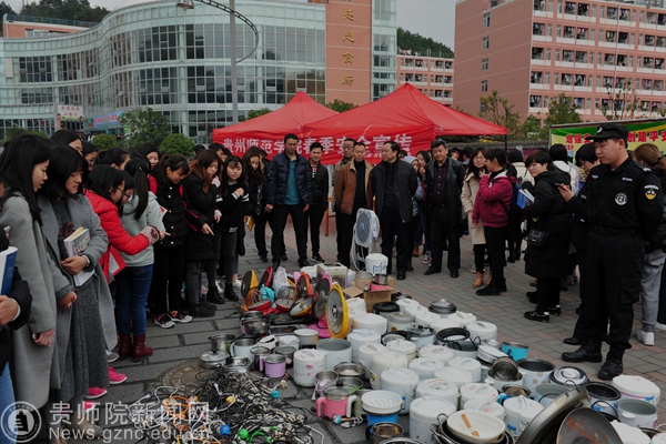 活动紧紧围绕春季安全用电这一主题展开,向同学们宣传安全用电的常识与应急处理办法,展示学生公寓收缴的部分违规使用的大功率电器。学校校长李存雄、副校长汪羿、副校长令狐荣锋到场参加宣传活动。