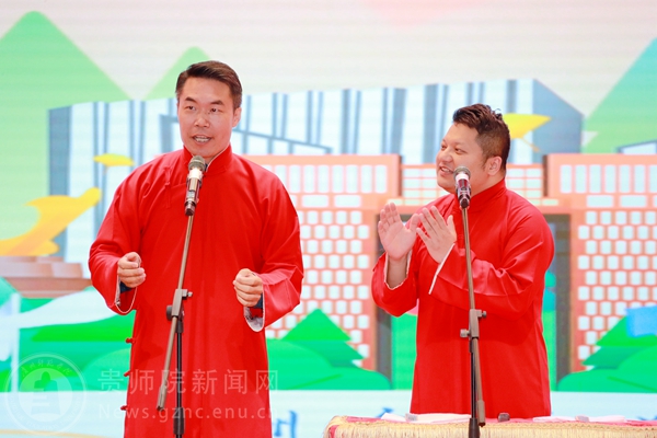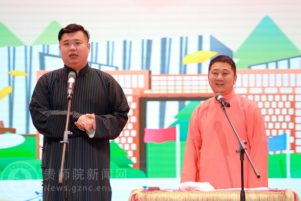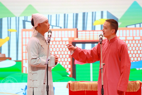 演出在高振洋先生《二十大精神放光芒》的快板声中拉开了帷幕,节奏鲜明、气势流畅的表演感情真实,声声清脆悦耳,句句引人共鸣,让广大观众在享受高质量的表演的同时,在春风化雨中传播党的好声音。随后,由刘振峰、陈丹带来《送你一支歌》,演员们娴熟的技艺惊艳全场,赢得观众阵阵掌声。接着,代正义、张尹为大家带来表演《欢声笑语》,“包袱”不断、笑料百出,台上演员说得起劲儿,台下观众听得带劲儿,惹得全场观众捧腹大笑,现场的气氛被一次次地推向了高潮。最后,演出在高振洋、穆伍先生的《文化达人》中落下了帷幕,在场的学生们深刻体会到了我国语言艺术的博大精深,接地气的表演展现了语言艺术的精髓,幽默中有机智,谈笑中有乐趣,带领同学们感受了相声艺术的乐趣,体会到优秀传统文化的独特魅力。