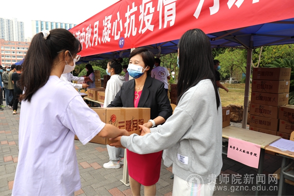 上午,鉴湖旁的长桌子上,摆满了种类多样的月饼,为在校全体师生赠送月饼。在佳节的浓厚氛围中,各学院志愿者闻讯赶来,有序排队,保持1米以上间隔距离,不扎堆、不拥挤,有序将学校的浓情厚意传达到全校师生手中。