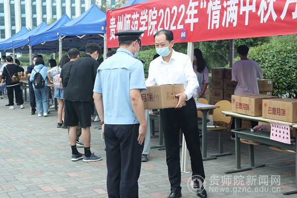 校党委书记石培新向工作人员发放月饼