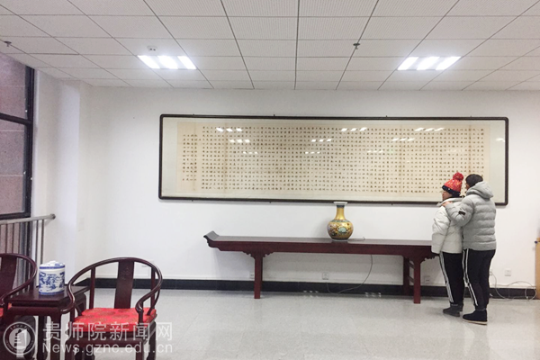 此次展览与以往艺术展览观赏形式不同,将传统展现模式与现代智能科技相结合,不仅每幅作品下都附有作品名称、作者、尺寸和所属年代,师生还可以使用手机扫描每一幅名家巨作下对应的二维码,即可观看对该作品的精讲视频。本次展览还引进了智能机器人“叮小胖”,智能机器人可以根据观看者的提问耐心讲解作品的作者、背景、观赏要素等。