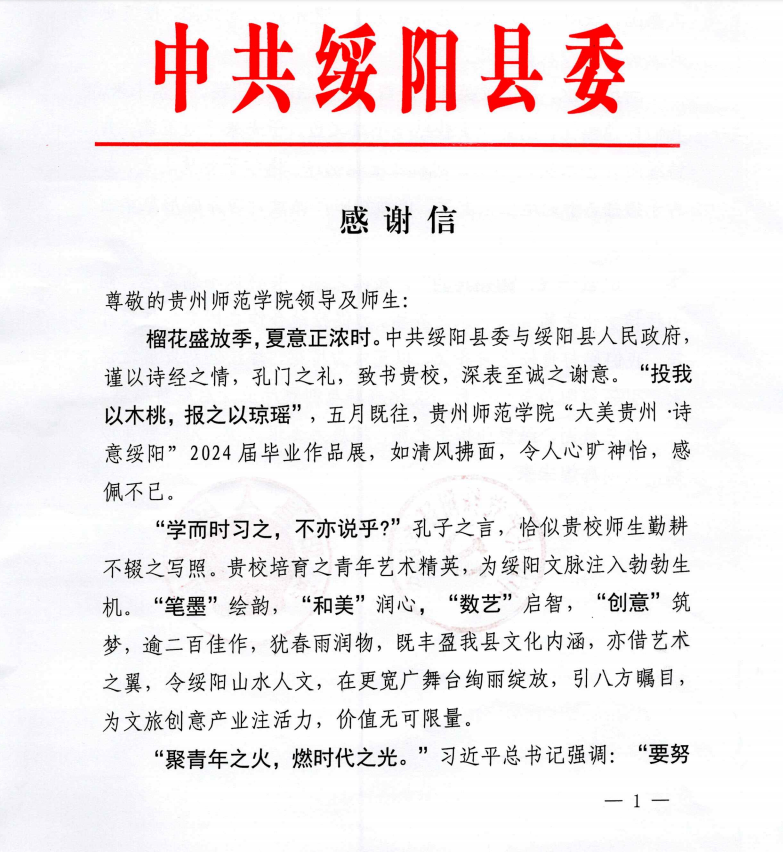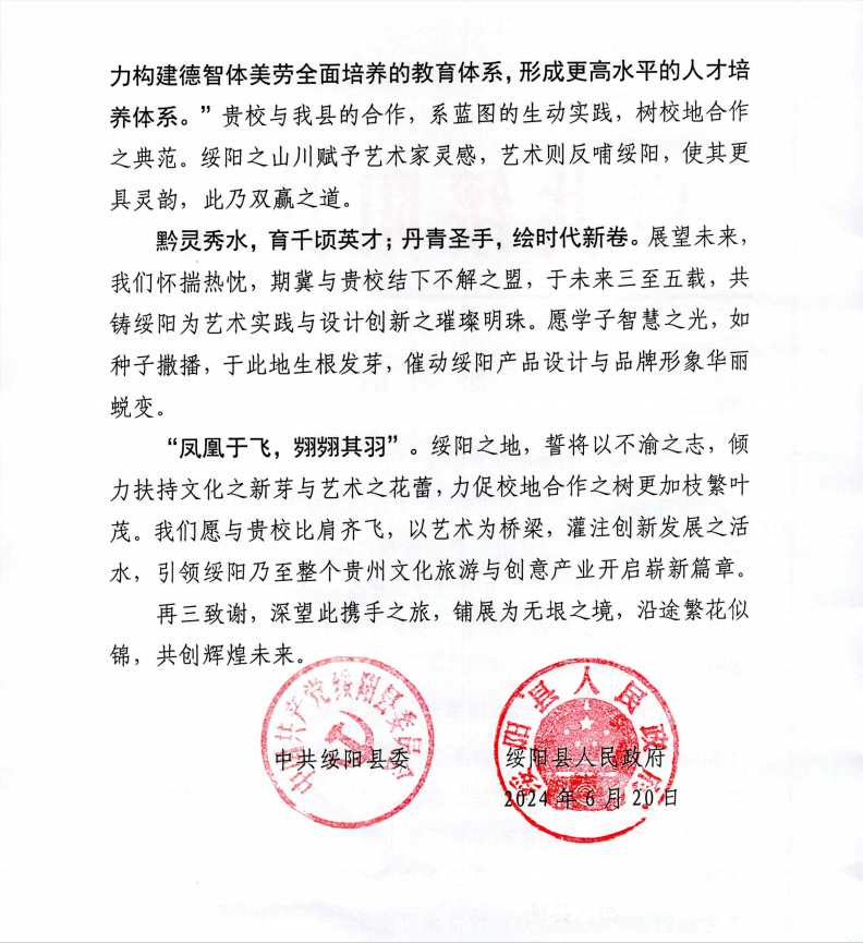 本网讯 近日,伟德官网与绥阳的校地合作再次传来佳音。美术与设计学院的毕业设计展览广受赞誉,绥阳县政府特地致函并赠予牌匾,以表彰伟德官网在合作中的贡献和努力。这一举措不仅彰显了伟德官网与地方合作的深厚情谊,也为伟德官网的未来发展开辟了新的篇章。