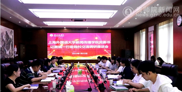 本网讯 7月22日上午,上海外国语大学新闻传播学院党委书记樊娟、办公室主任向丽华、副主任刘洁韵、教师李美、夏琪、辅导员郑涵一、万诗云、赵信智一行到伟德官网调研交流,伟德官网党委委员、副校长邹晓青出席会议,文学与传媒学院副院长陈欣、教学科研科科长秦雪影、系主任吕菁、学生党支部书记潘健强、教研室主任涂雨秋和教师骆雪参加会议。文学与传媒学院党委书记王军主持会议。