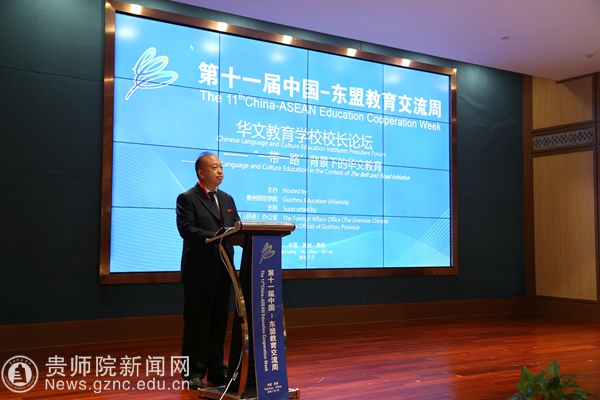 贵州省人大常委会副主任、秘书长陈鸣明为论坛致开幕辞,他讲到华文教育是面向海外千千万万的华侨华人开展的民族语言、民族文化的教育、传承与传播工作,是中华文化海外传播的特殊形式,是维系海外华侨华人与祖国情感的关系纽带,也是促进海外华人华侨社会和谐发展的内在动力。今年,是“中国—东盟教育交流周”举办的第十一个年头。前面的十年,“中国—东盟教育交流周”从初始走向成熟,逐渐发展成为中国与东盟国家教育合作、人文交流的高端平台,成为互学互鉴、合作共赢的坚实桥梁。近年,贵州省深入贯彻落实习近平总书记系列重要讲话精神和治国理政新理念新思想新战略,牢牢守住发展和生态两条底线,深入实施大扶贫、大数据、大生态三大战略行动,积极融入“一带一路”建设,借助中国—东盟教育交流周等重要平台,全方位扩大开放,多领域推进合作,经济社会发展势头良好,后发优势、区位优势进一步凸显。贵州高等教育积极推行走出去战略,坚持开放办学、合作办学,贵州高等教育的国际化战略扎实推进并取得了一系列实实在在的成果。华文教育已经成为贵州与东盟国家教育交流、文化共享的重要窗口,成为培养华裔人才、展示贵州形象和文化底蕴的有效载体。