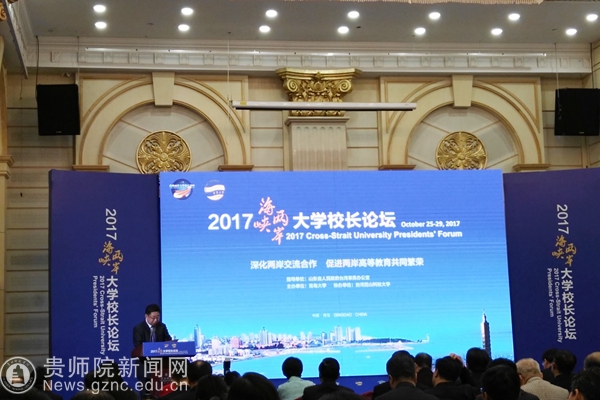 本网讯 10月25至27日,由青岛大学校主办、台湾昆山科技大学协办的“2017海峡两岸大学校长论坛”在黄海饭店举行。山东大学、中国海洋大学、中国石油大学(华东)、山东科技大学、济南大学、山东理工大学、鲁东大学、烟台大学、伟德bv国际体育、台湾中国文化大学、台湾海洋大学、台湾艺术大学、大同大学、高雄大学、修平科技大学、昆山科技大学等来自海峡两岸的近50所大学的100余名校长、两岸事务部门负责人和专家学者参加了本次论坛。伟德官网校长郁钟铭应邀参会,党政办主任芦军、对外交流合作处处长张瑶随同参会。