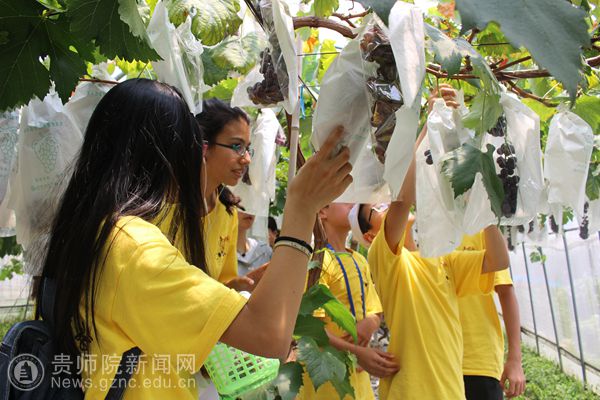 8月2日,营员们来到凯里云谷田园。首先,导游带领营员参观了果园;其次,营员们进入果园采摘巨峰葡萄。在采摘过程中营员们体会到了采摘水果的乐趣以及和同伴合作的精神。