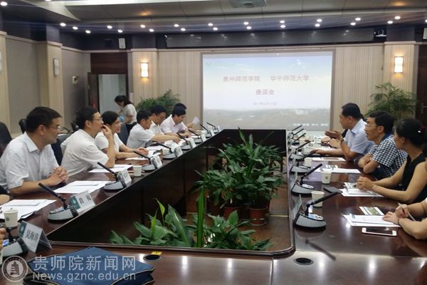 华中师范大学党委书记黄晓玫、校长杨宗凯,副校长黄永林、党委常委骆军率学校办公室、发展规划处、人事处、研究生院、音乐学院、科研部负责人等会见了石培新、郁钟铭一行并召开对口支援工作座谈会。黄晓玫、杨宗凯对石培新、郁钟铭一行表示热烈的欢迎。黄晓玫表示,两校自2011年与2016年签订两轮对口支持框架协议以来,校领导带队互访频繁,对口支援工作得到有效深入推进,既圆满完成了国家关于对口支援工作的各项计划,又相互学习与交流了经验、锻炼了队伍,工作成果卓有成效。她希望与贵州师院的合作能够在框架协议的基础上固化下来,进一步落实对口支持框架协议项目,把项目任务下沉到各职能部门及二级学院乃至专业上,以期取得更实在的成效。