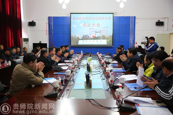 李存雄代表学校致欢迎辞,随后陈智勇宣读了贵州省乒乓球协会对于高校分会成立的批复以及机构成员名单。曾羽宣读了《贵州省乒乓球协会高校分会章程》,在章程里提到了本次分会的宗旨是“团结全省高校乒乓球工作者运动员和积极分子,发展乒乓球运动,推动乒乓球运动在贵州省高校的通行和技术水平的提高,加强各高校之间的联系与合作”。