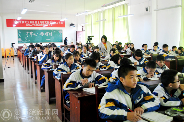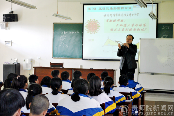 此次研讨会特别邀请国际教育数学协会(IAEM,美国)副秘书长、成都市学科带头人、成都市特级校长、邛崃市赖虎强名师工作室领衔人赖虎强老师为乌当二中张景中教育数学创新实验班进行示范课展示,本次活动他所讲授的是《正弦三角形面积公式》。此课题是以张景中院士的《一线串通的初等数学》为基础展开,课题以动画开篇,引起了学生对数学的兴趣。示范课结束后,所有参加活动的人员进行讨论。