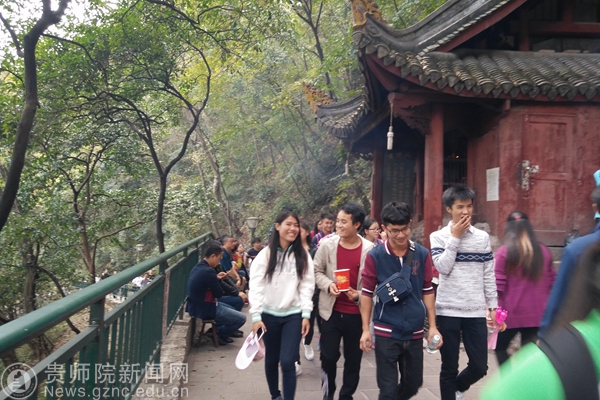 本网讯 11月27日,为了丰富泰国学生在伟德官网的课余生活,在学校的统筹部署下,伟德官网文学院经过多番的讨论,在确保学生安全的前提下,精心安排,认真组织了17位汉语国际教育专业学生带领9位泰国学生前往黔灵山参观旅游。