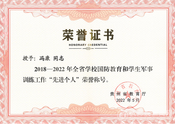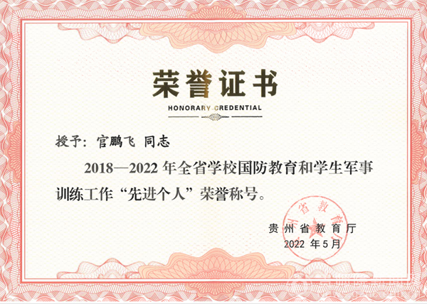 本网讯 根据《省教育厅关于表彰2018—2022年全省学校国防教育和学生军事训练工作先进单位和个人的决定》文件,伟德官网通过积极申报,获评“2018—2022年贵州省学校国防教育和学生军事训练工作先进单位”,外国语学院专职辅导员冯康和学工部副部长官鹏飞获评“贵州省学校国防教育和学生军事训练工作先进个人”。