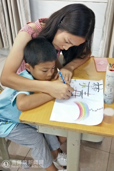 志愿者指导学生制作手抄报