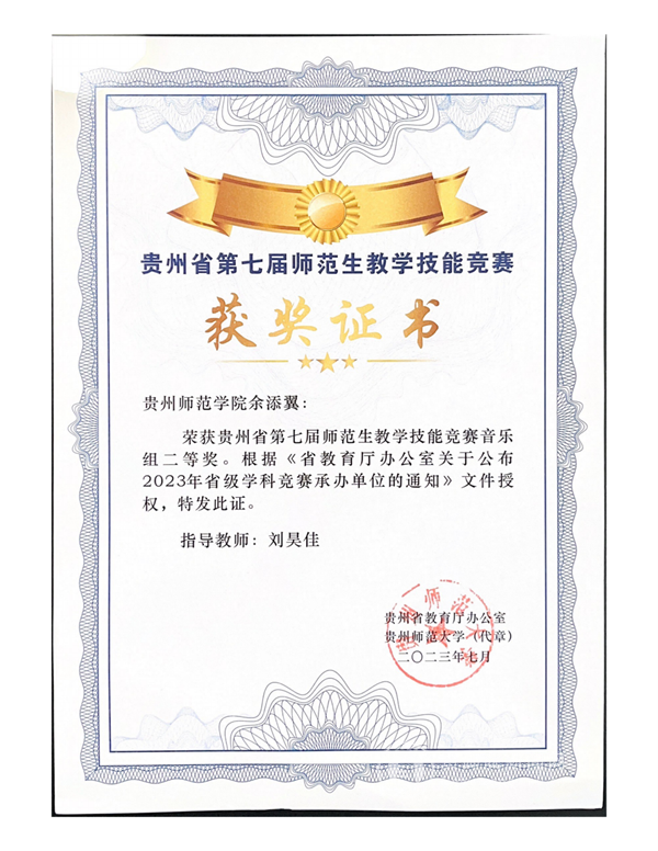 贵州省第七届师范生教学技能竞赛获奖证书