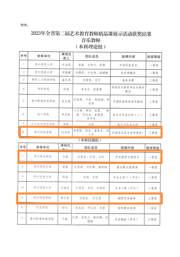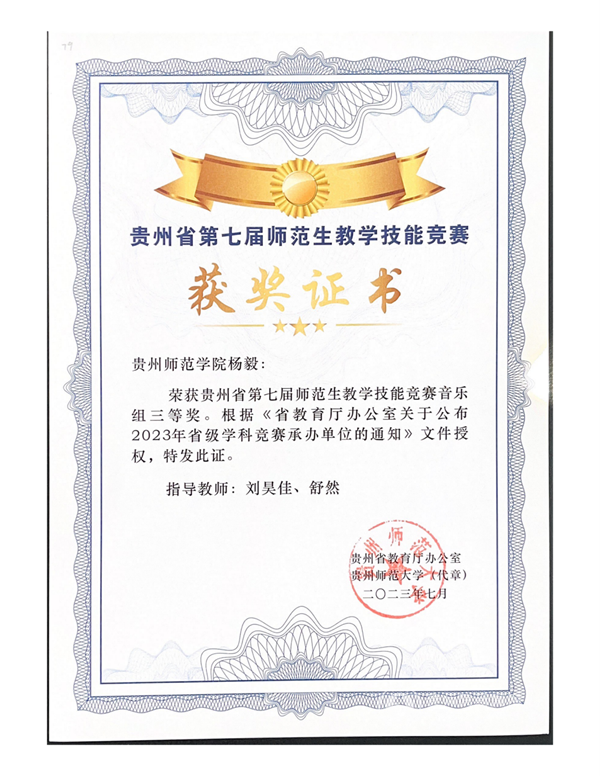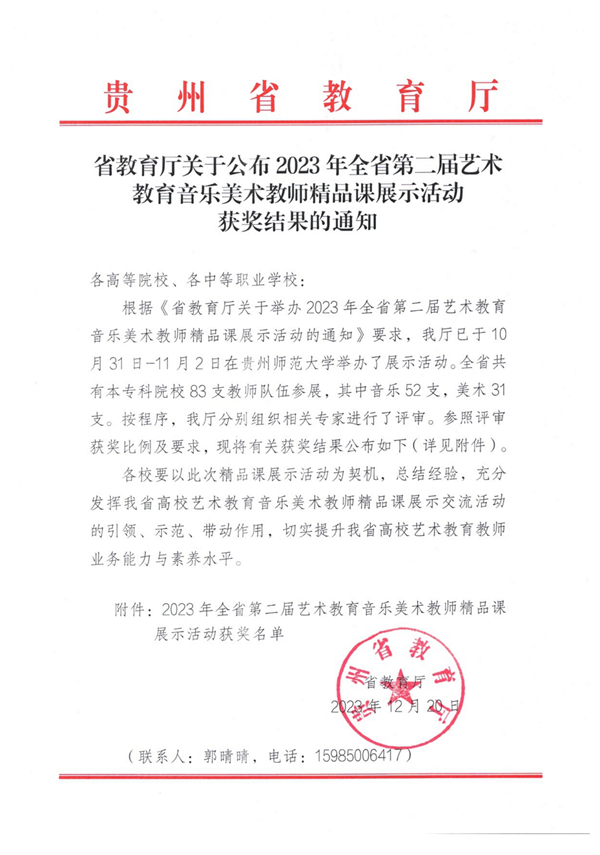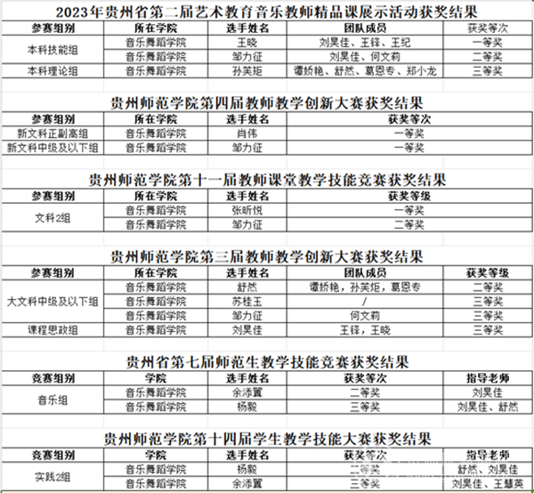 王晓、邹力征两位老师分别获得2023年贵州省第二届艺术教育音乐教师精品课展示活动本科技能组一等奖和二等奖;孙芙炬老师获得2023年贵州省第二届艺术教育音乐教师精品课展示活动本科理论组三等奖;伟德bv国际体育获得优秀组织奖。