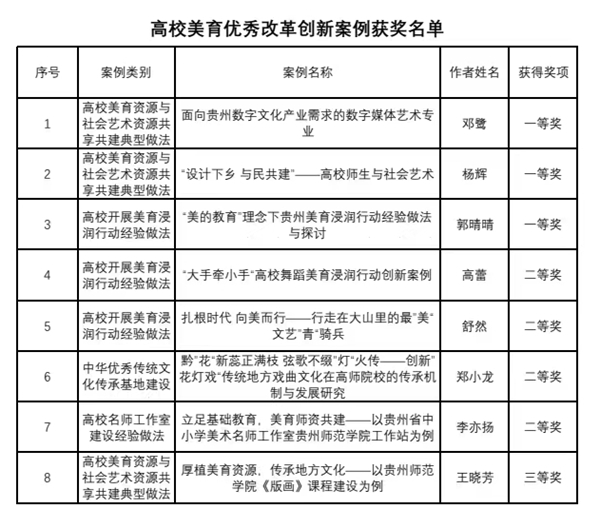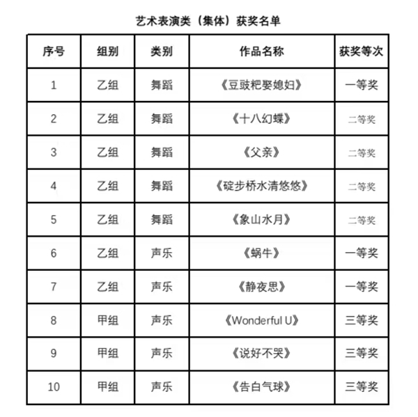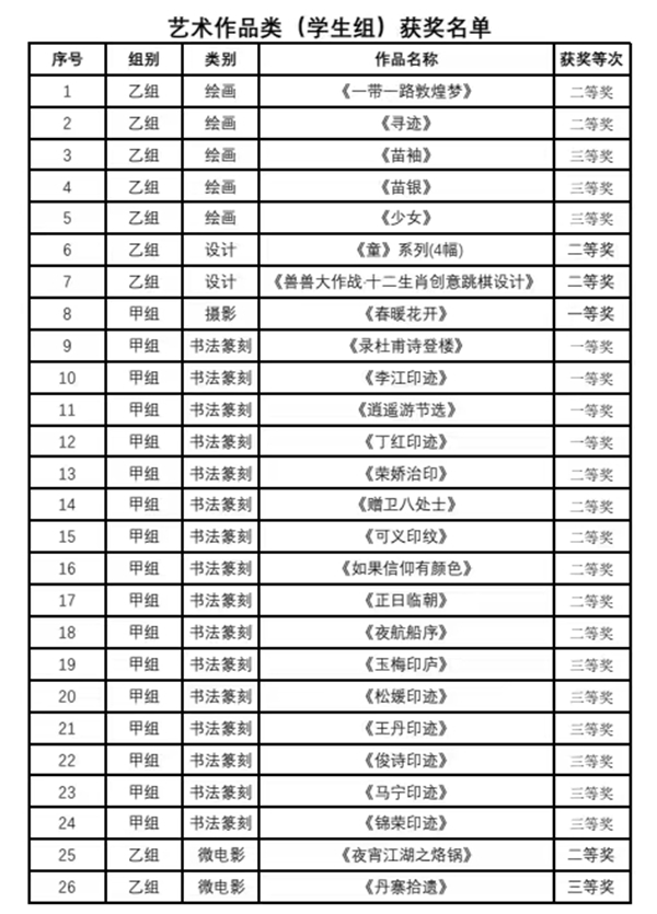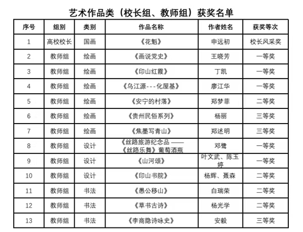 伟德官网在全省竞赛中共获得三等奖以上奖项65项,其中艺术表演类(集体)奖项10项、艺术表演类(个人)项目6项、艺术作品(校长、教师)奖项13项、艺术作品(学生)奖项26项、艺术实践工作坊2项、高校美育优秀案例8项。其中一等奖20项、二等奖27项、三等奖17项。同时,伟德官网荣获优秀组织奖。伟德官网的部分作品将代表贵州省参加全国大学生艺术展演的竞赛,预祝伟德官网作品在全国竞赛中取得好的成绩。