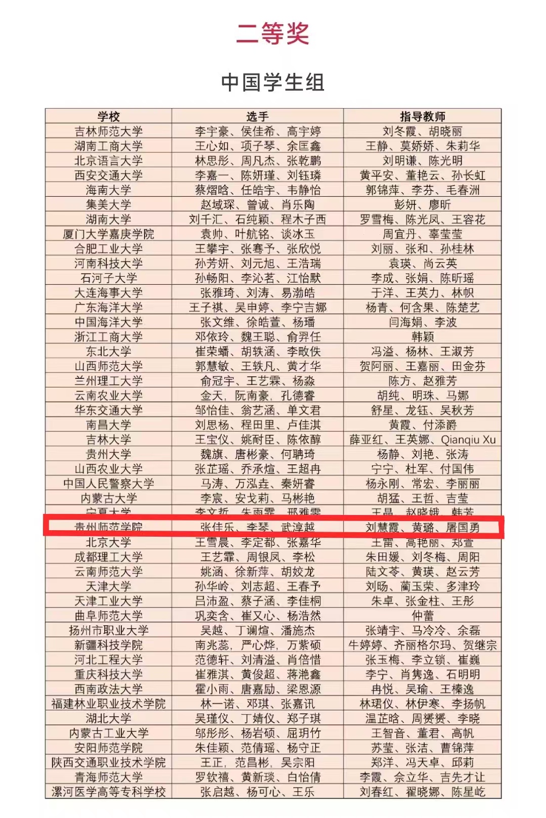 此次全国高校学生跨文化能力大赛,以“坚定文化自信 增进国际理解”为主题,吸引了来自28个省市自治区1000多所高校的3000多名学生参加。前期经校赛、省赛比拼,伟德官网张佳乐、李琴、武淳越三位同学组成的伟德bv国际体育代表队,同贵州大学代表队一道成为首次晋级全国决赛的贵州高校代表队。决赛现场,经过案例开发与展析、名言名句解读、知识问答、情境述评和讲述中国故事等多项比赛环节的考察,最终荣获国奖二等奖。