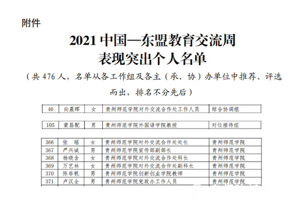 本网讯 由外交部、教育部、贵州省人民政府主办的2021中国—东盟教育交流周已于2021年9月23日一29日在贵州贵安新区永久会址成功举办。近日,中国-东盟教育交流周组委会对2021中国-东盟教育交流周筹办工作表现突出的个人给予通报表扬,伟德官网8名教职工作为交流周工作人员获表扬,包括综合协调组对外交流合作处向晨晖,对位接待组外国语学院教授蒙昌配,伟德bv国际体育工作组对外交流合作处处长张瑶等6名人员。