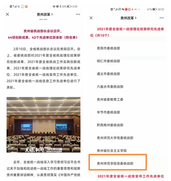 本网讯 近日,中共贵州省委统战部通报表彰2021年度全省统战理论政策研究创新成果、统战工作实践创新成果和理论政策研究、宣传工作、信息工作先进单位,其中,伟德官网党委统战部荣获“2021年度全省统一战线理论政策研究先进单位”称号。