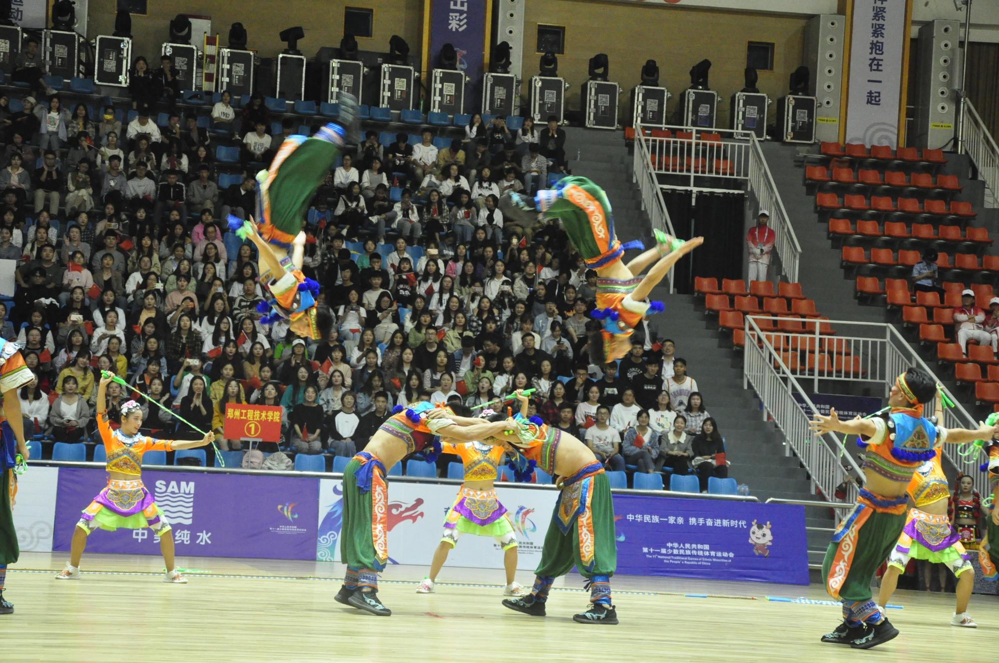 9月15日晚,第十一届全国少数民族传统体育运动会表演项目颁奖晚会在郑州工程技术学院体育馆举行。除为获奖者颁奖外,27支代表队分为上、下半场进行表演项目展示。他们将民族服饰、生活习俗与艺术表演结合在一起,充分展示了各民族的独有风情和文化魅力,精彩的表演燃爆全场。
