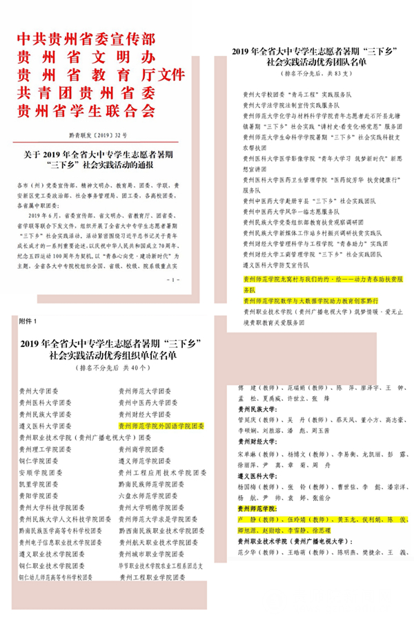 本网讯 为推进“三下乡”社会实践活动持续深入开展,在实践育人中发挥更加突出的作用。日前,省委宣传部、省文明办、省教育厅、团省委、省学联等联合下发《关于2019年全省大中专学生志愿者暑期“三下乡”社会实践活动的通报》文件,对在2019年全省大中专学生志愿者暑期“三下乡”社会实践活动表现突出的团组织、团队和个人进行通报表扬。通过遴选,伟德官网外国语学院团委获评“优秀组织单位”、教育科学学院“龙窝村与我们的约·绘—动力青春助扶贫”志愿者服务团队、数学与大数据学院“助力教育创客黔行”志愿服务队分别荣获“优秀团队”、外国语学院卢静、数大学院伍玲婧两位老师及化材学院黄玉龙、教科院侯利娟、历档学院陈俊、美设学院卿旭源、数大学院赵勋晗、外国语学院李雪静、文传学院徐思碟7位学生荣获“优秀个人”荣誉称号。