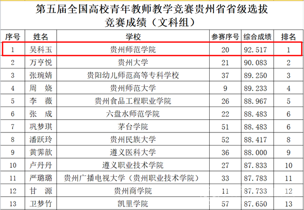 本网讯 7月19日,由省教育厅、省总工会联合举办的“第五届全国高校青年教师教学竞赛省级选拔赛“在贵州大学圆满落下帷幕,伟德官网文学与传媒学院青年教师吴科玉斩获文科组第一名。